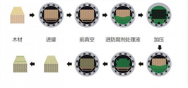 目前大多數(shù)采用的是高壓浸罐處理,高壓浸罐法是將木材經(jīng)過(guò)嚴(yán)格的蒸汽、烘干、拋光、成形后將防腐劑真空注入木材細(xì)胞組織內(nèi),將防腐劑固定在細(xì)胞纖維組織內(nèi),達(dá)到防腐效果。